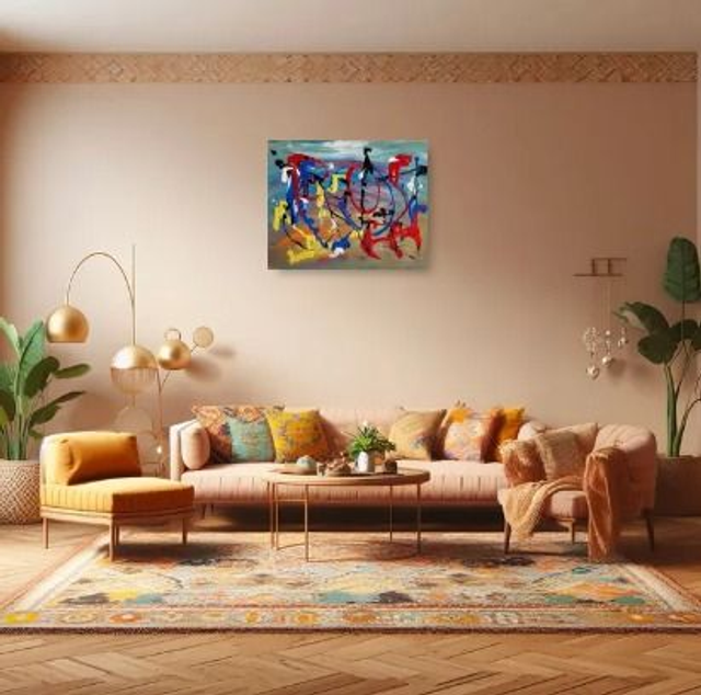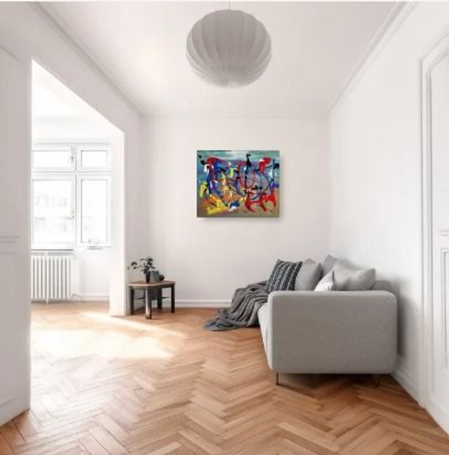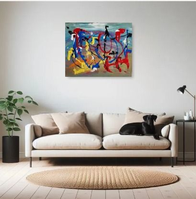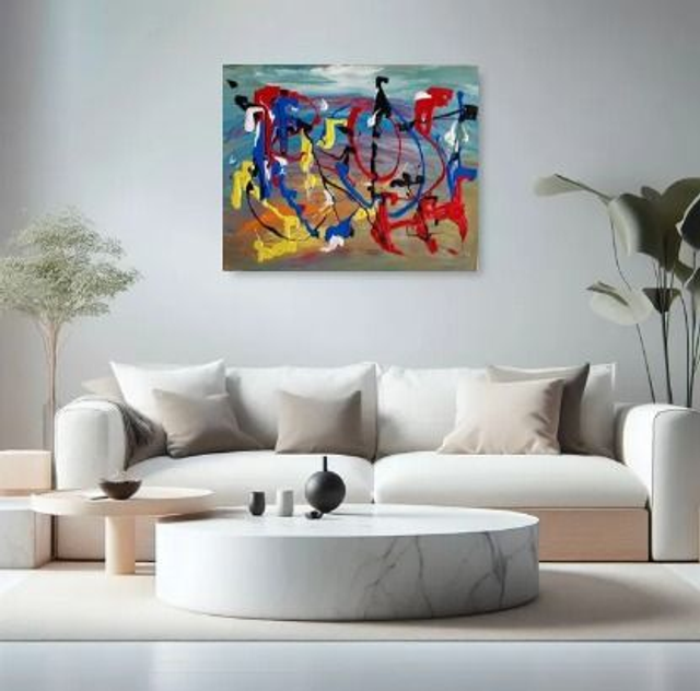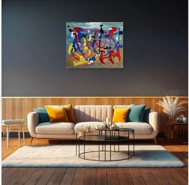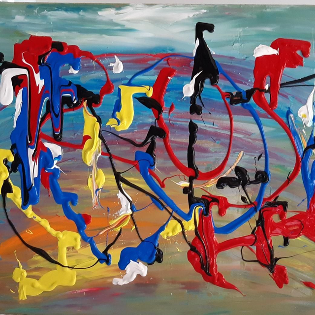 L' Artiste à réalisé un tableau abstrait avec effet 3D de son imaginaire avec beaucoup d' amplitude dans le geste...