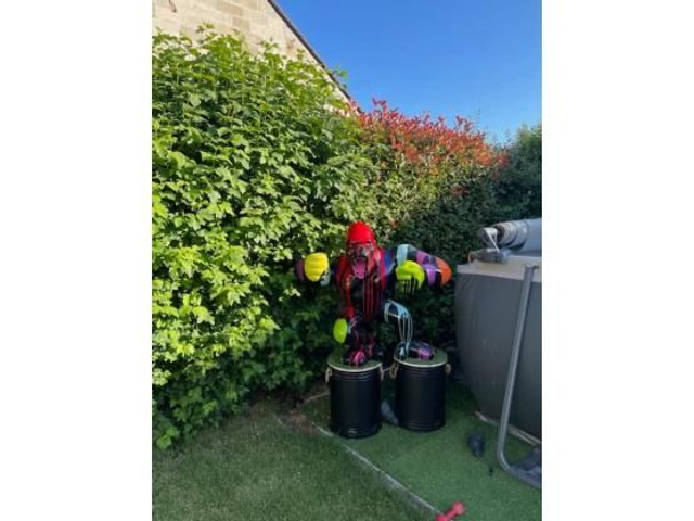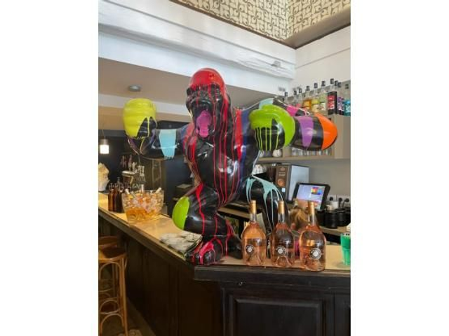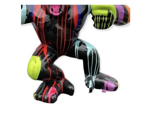 En résumé, il s'agit d'une sculpture de gorille stylisée et colorée, conçue comme une pièce d'art décorative contemporaine. L'utilisation de couleurs vives et de coulures lui confère une esthétique pop et dynamique qui s' intègre en intérieur et extérieur dans un parc ou sur le bord d' une piscine.