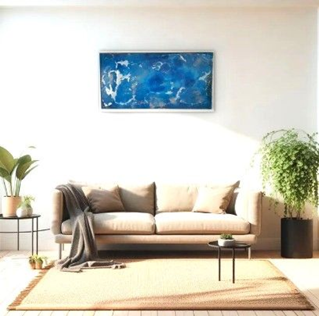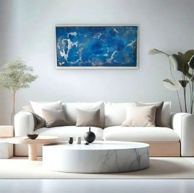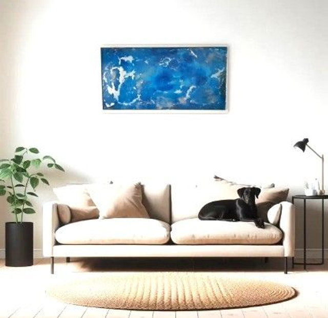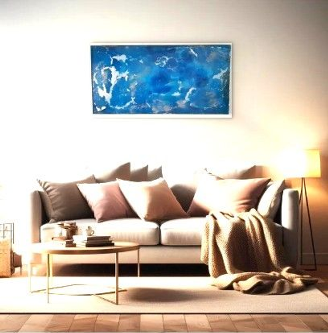 The Artist created this painting representing an atoll in Polynesia... (in the dark the effect of the fluorescent pigments lights up the painting). Techniques: Resin, color pigments and fluorescent pigments. Dimensions: 123x61 cm Sold with a certificate of authenticity and an invoice. Aluminum frame